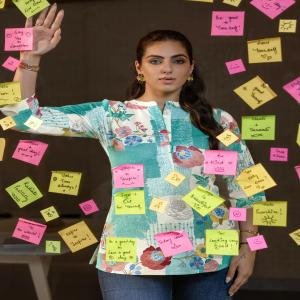 Our green printed cotton straight short kurti features a mandarin collar and three-quarter sleeves. Adorned with floral prints and buttons, this style is best for casual outings.