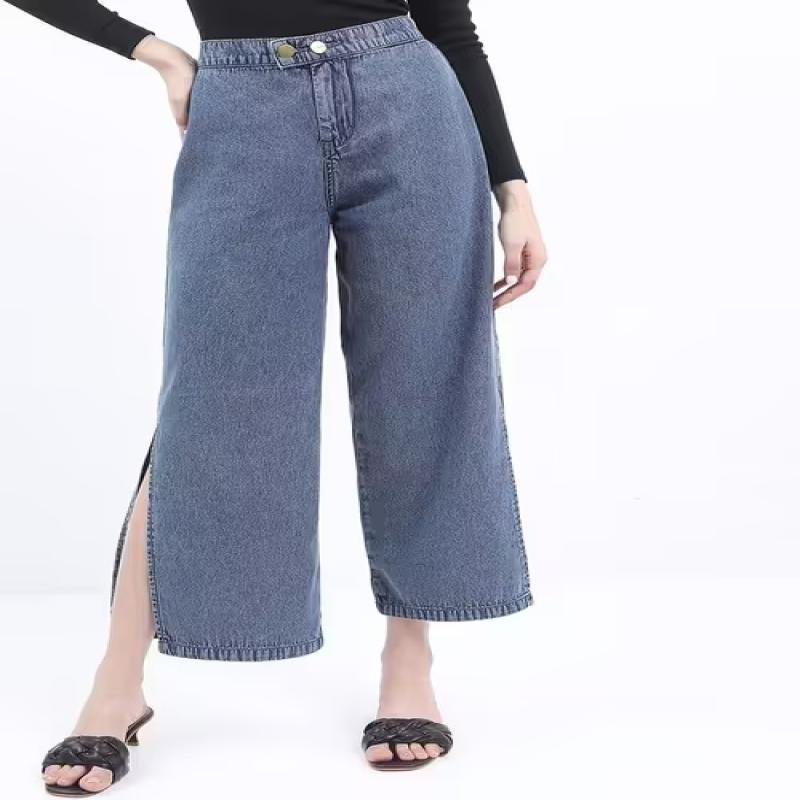 Women solid high rise wide leg jean